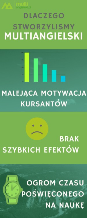 Jako angliści z ponad 20 letnim doświadczeniem w nauczaniu języka angielskiego zaobserwowaliśmy, że nawet do 75% osób nie kończy standardowych – około 2 letnich kursów języka w szkołach językowych. Według naszej analizy za takim stanem rzeczy stoją trzy najważniejsze powody: